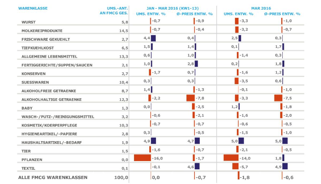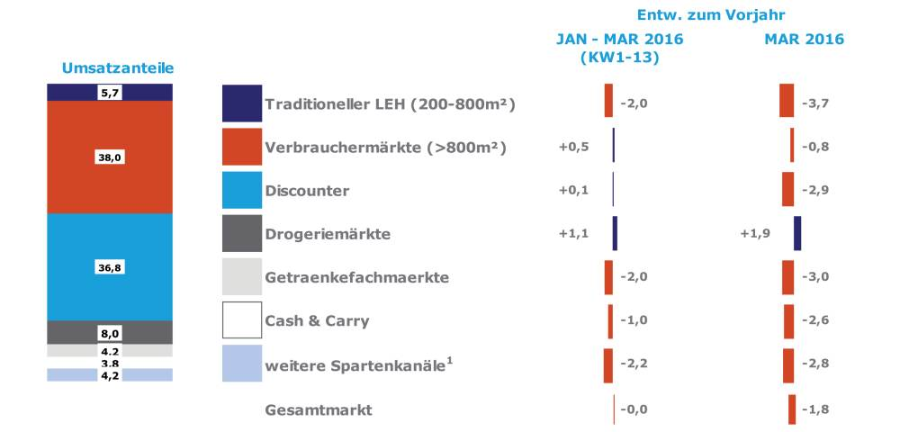 Kanäle: Der Gesamtmarkt ist mit 0 % im Zeitraum Januar bis März 2016 im Vergleich zum Vorjahr stabil geblieben. Im Monat März hat der Gesamtmarkt mit -1,8% im Vergleich zum Vorjahr allerdings weniger Umsatz realisiert. Der traditionelle LEH ist mit -3,7 % rückläufig.