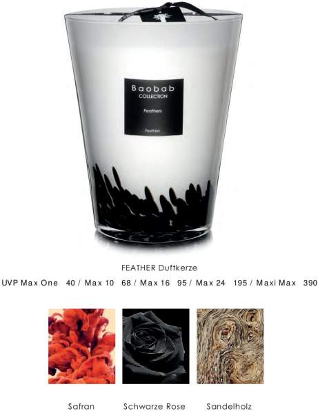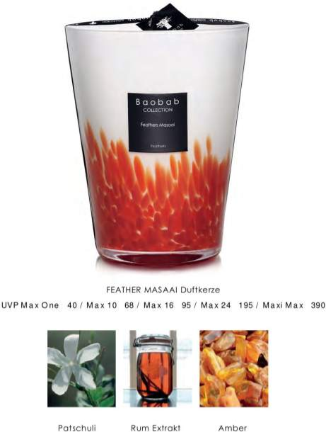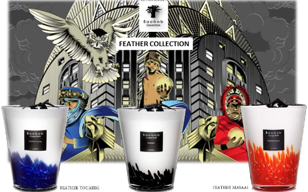 Die Feather Duftkerzen Kollektion von Baobab Collection ist inspiriert von der ergreifen- den Saga eines gemischtrassigen Jungen namens Feather, der von afrikanischen Kriegern großgezogen wird, umgeben von der mystischen Aura von Afrikas Flora und Fauna. Nach und nach entfalten sich seine magischen Kräfte, Licht und Bewusstsein zu offenbaren und sich mit der Natur und ihren Schöpfungen zu verständigen und zu verbinden. Diese Gabe provoziert den Neid seines Onkels, eines begnadeten Handwer- kers und Künstlers. Feather muss fliehen und sein Abenteuer durch neue Kulturen auf dem Weg zur Erleuchtung beginnt.