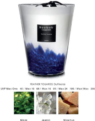 Die Tuareg, auch «die blauen Männer» wegen der Farbe ihrer Kleidung genannt, sind ein Nomadenvolk und werden als Herren der Wüste angesehen. Die FEATHER TOUAREG Kerze mit ihren dunkelblauen Details verweist auf die Farbe der majestätischen Erscheinung dieses Stammes. Die Duftnoten von Minze und Jasmin zaubern Visionen von festlichen Abenden um ein Feuer bei einem Tee, während man die vielfältige faszinierende Duftkulisse von Afrika wahrnimmt.