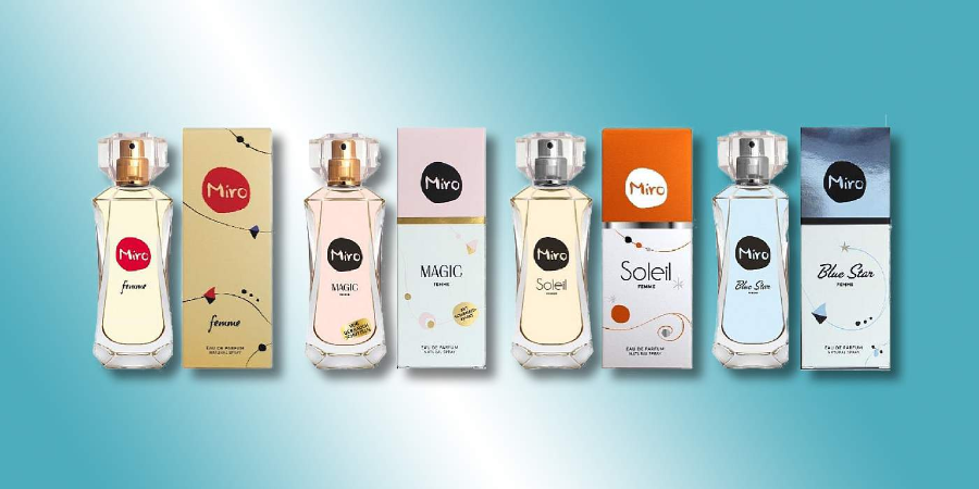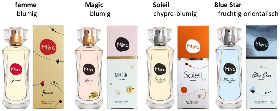 Auch weiterhin im Sortiment: Die vier beliebten Miro Düfte femme, Soleil, Magic und Blue Star – jetzt in neuem Design.